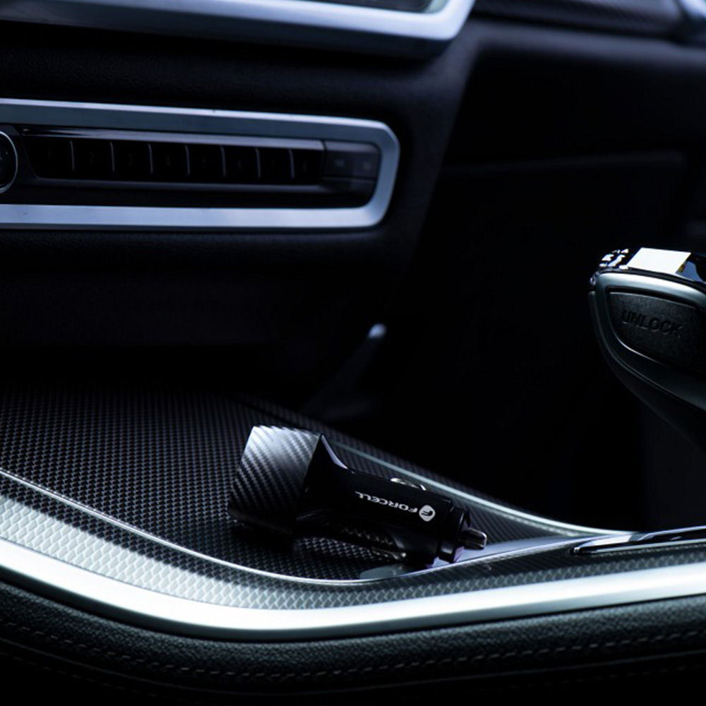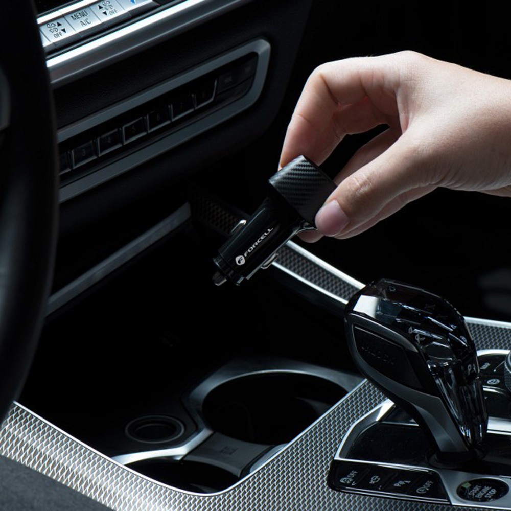 Niewielki rozmiar ładowarki Forcell Carbon doskonale sprawdzi się w ograniczonej przestrzeni wnętrza samochodu. Kompaktowa konstrukcja umożliwia wygodne użycie po wpięciu do gniazda zapalniczki, a także nie wymaga wiele przestrzeni w schowku do przechowywanie. Akcesorium doskonale komponuje się z wnętrzem każdego auta, a to wszystko za sprawą wzoru z włókna karbonowego, który nadaje ładowarce prestiżowego wyglądu.