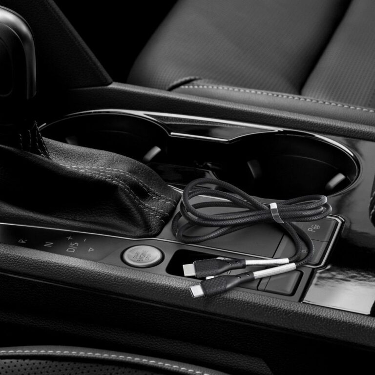 A solid metal casing with carbon fiber details combines design with functionality. The cable is resistant to bending, pressure, and heavy use.