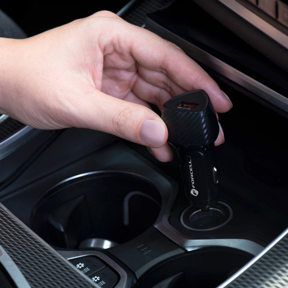 Niewielki rozmiar ładowarki Forcell Carbon doskonale sprawdzi się w ograniczonej przestrzeni wnętrza samochodu. Kompaktowa konstrukcja umożliwia wygodne użycie po wpięciu do gniazda zapalniczki, a także zajmuje niewiele miejsca po włożeniu do schowka. Akcesorium doskonale komponuje się z wnętrzem każdego auta, a to wszystko za sprawą wzoru z włókna karbonowego, który nadaje ładowarce prestiżowego wyglądu.