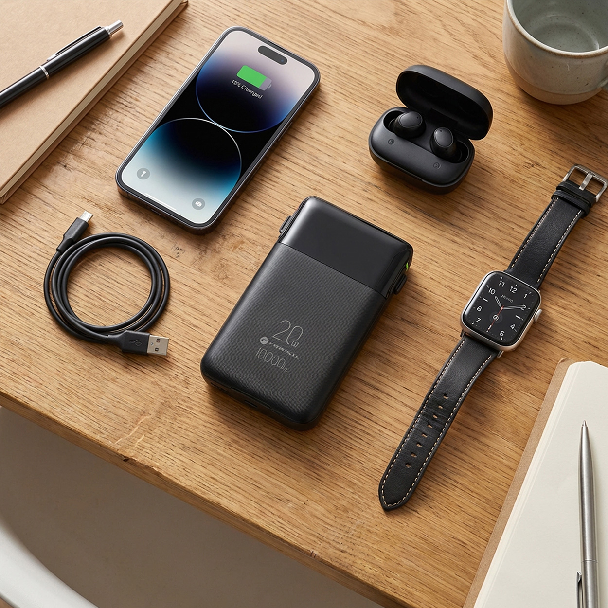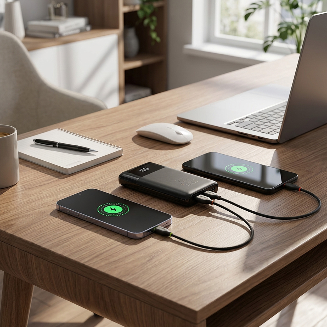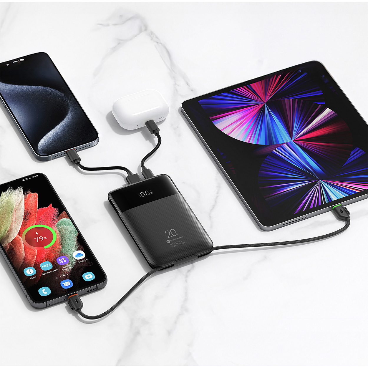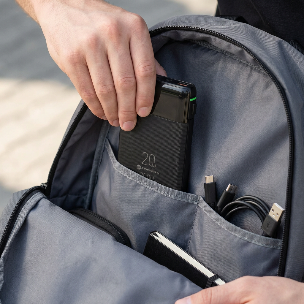 The powerbank comes with built-in USB-C and Lightning® cables, so you don’t need to bring extra accessories. It can charge up to four devices simultaneously, which is excellent for travel and everyday use.